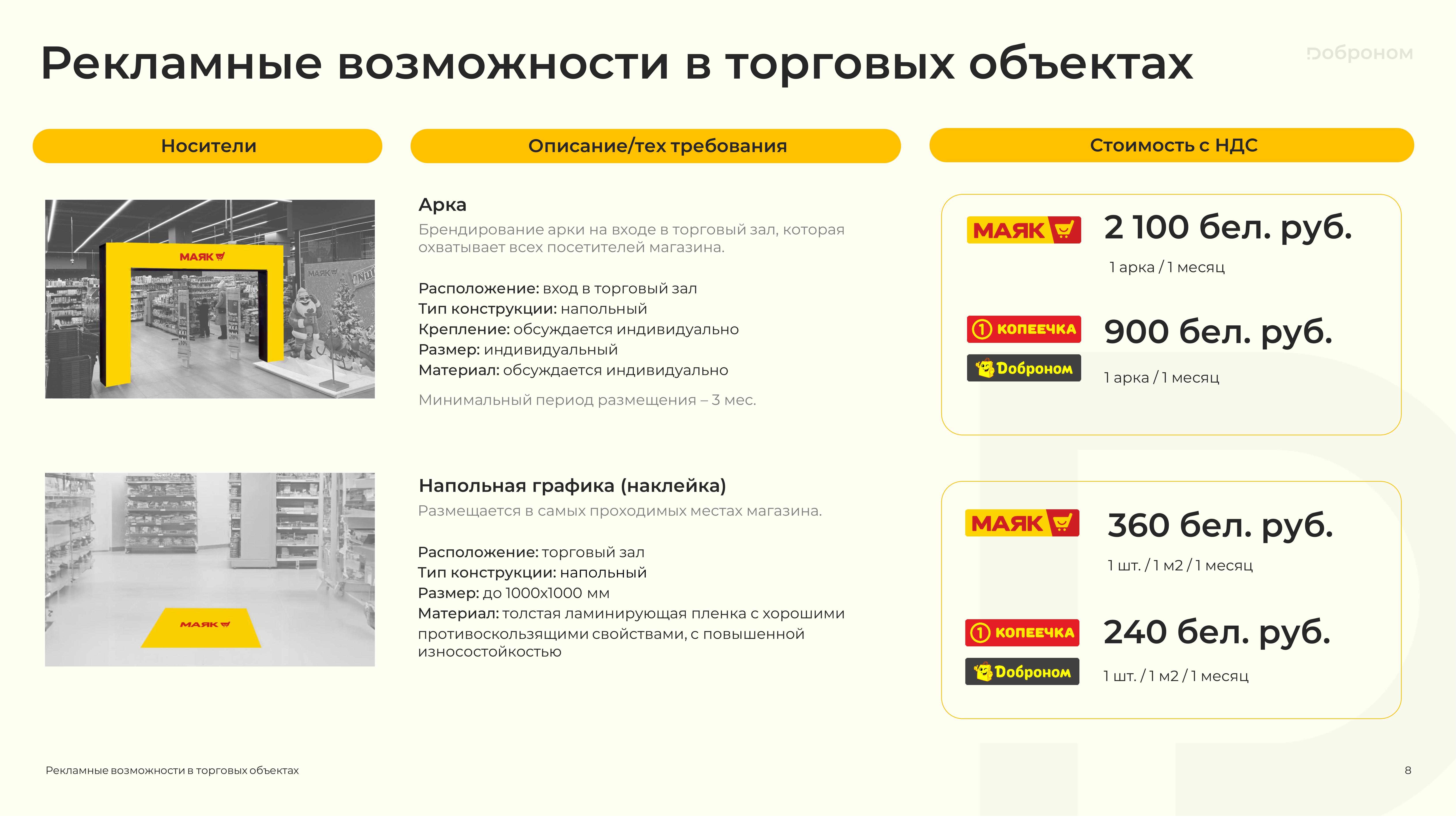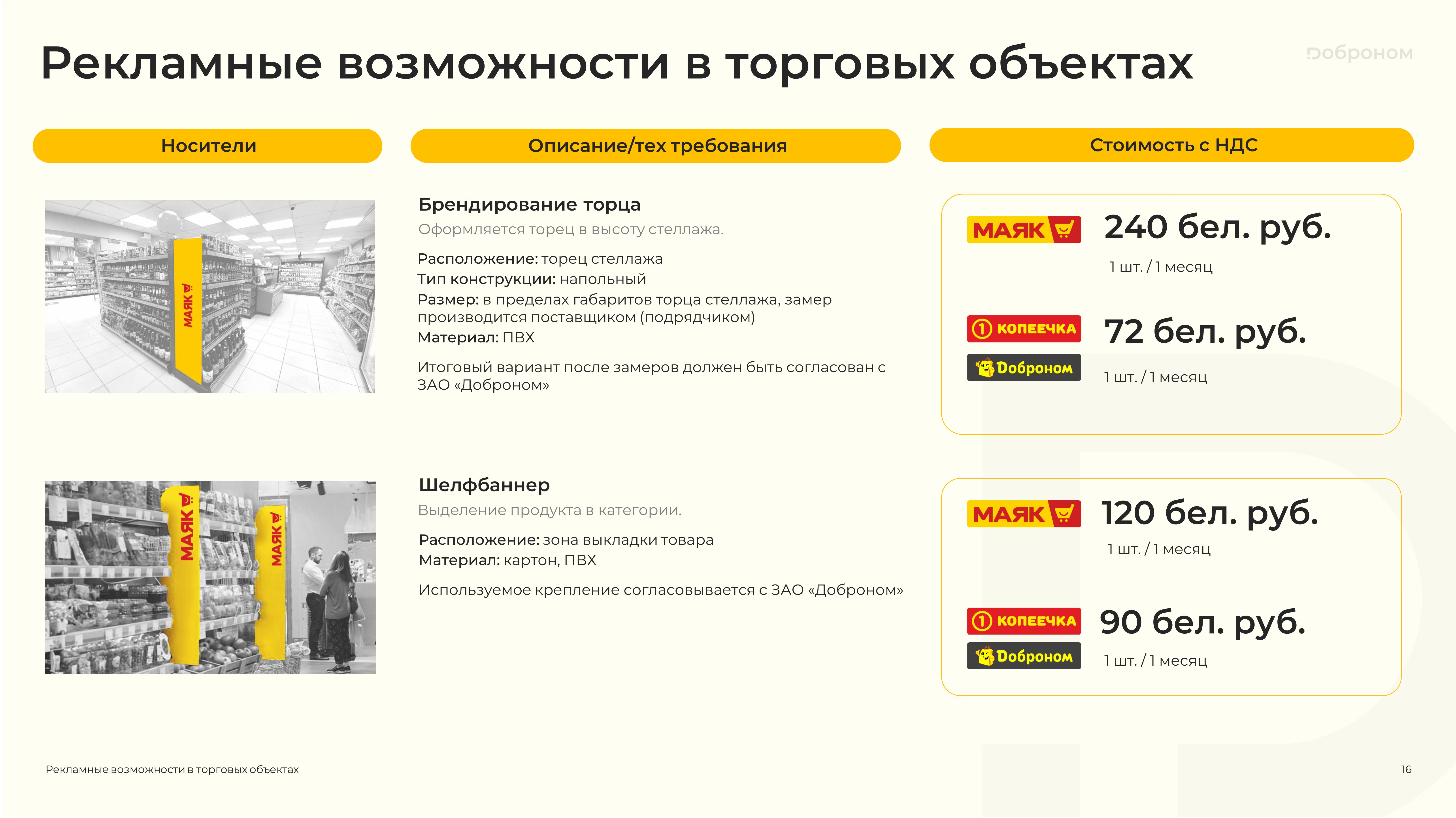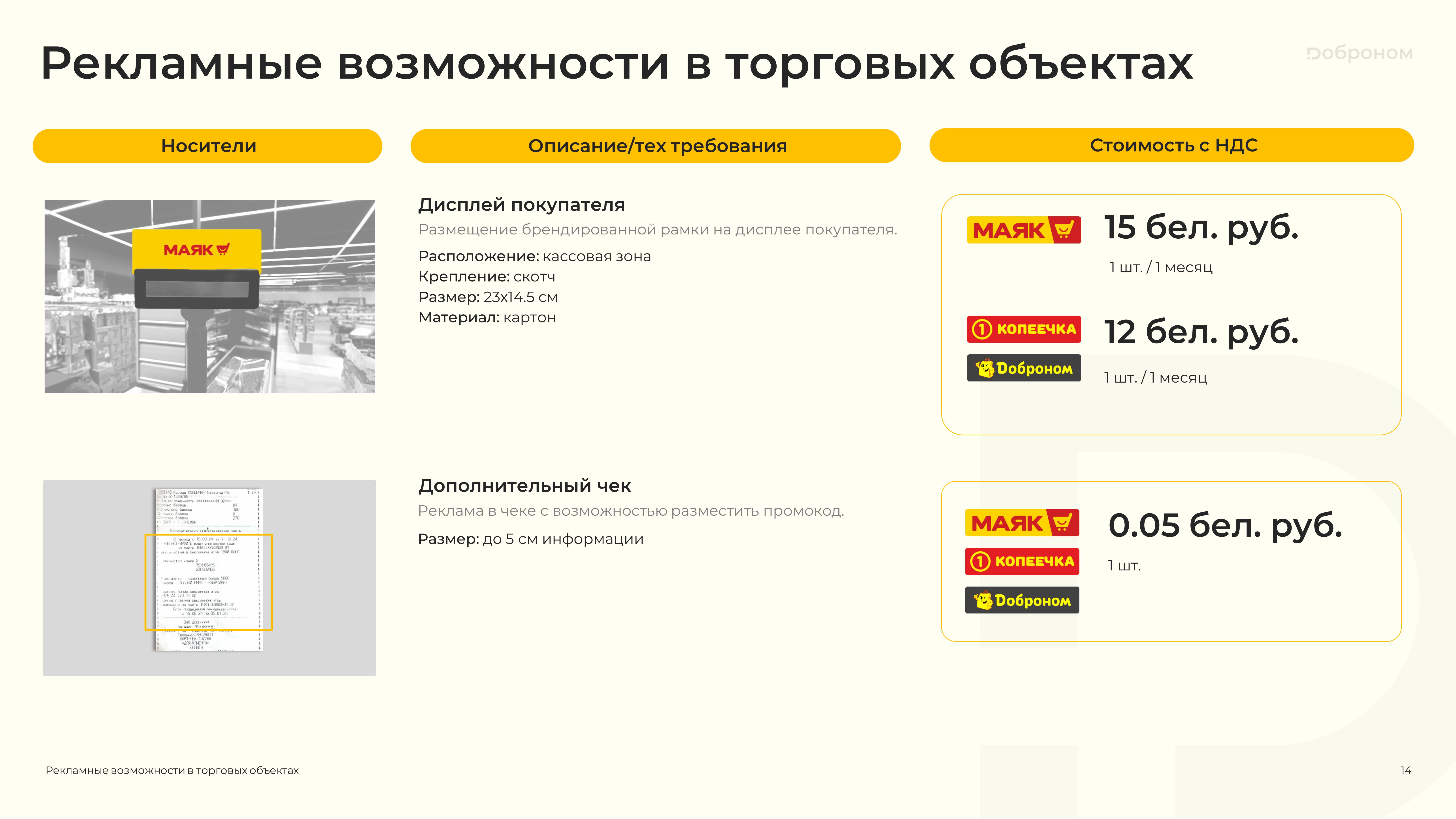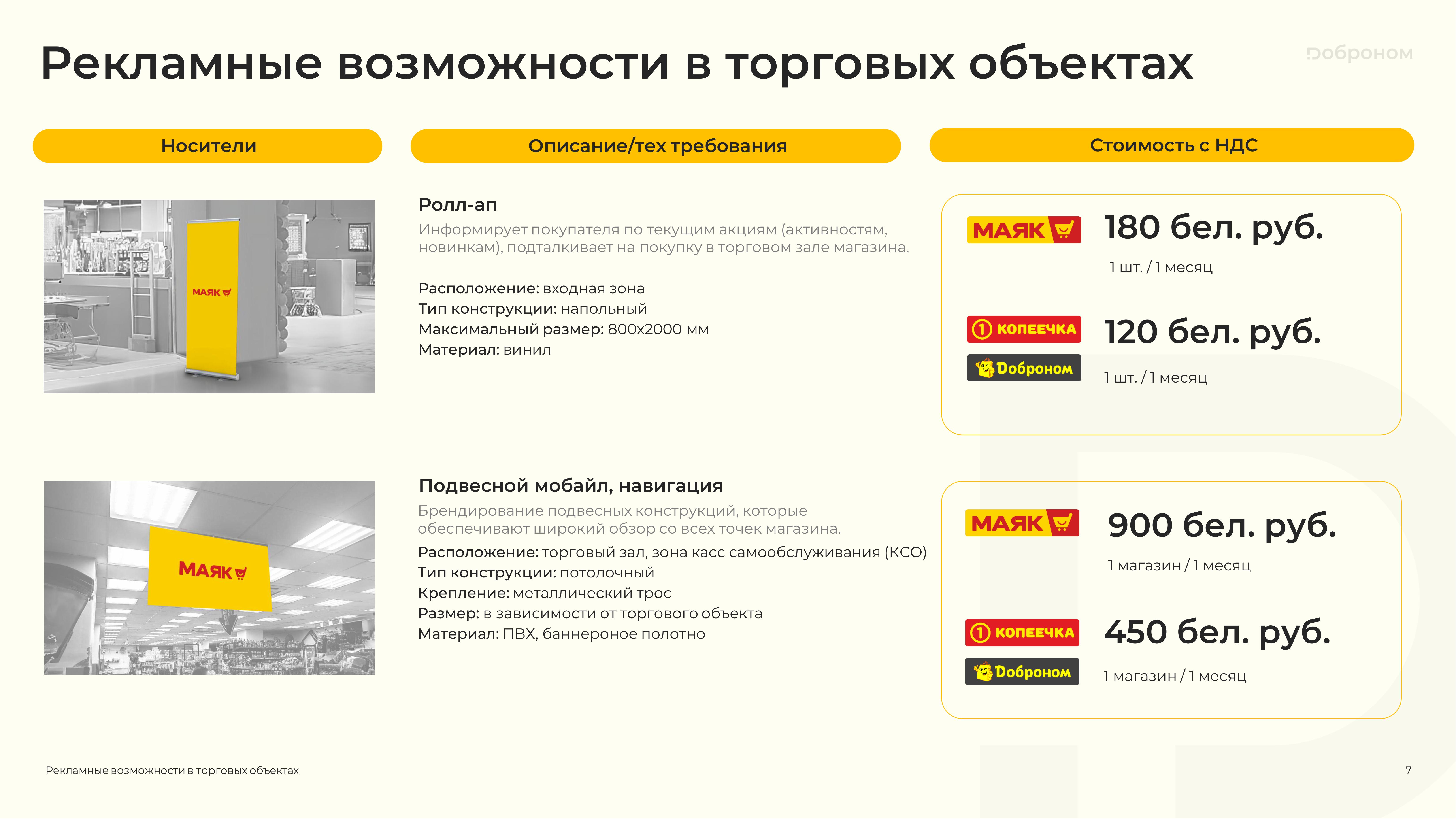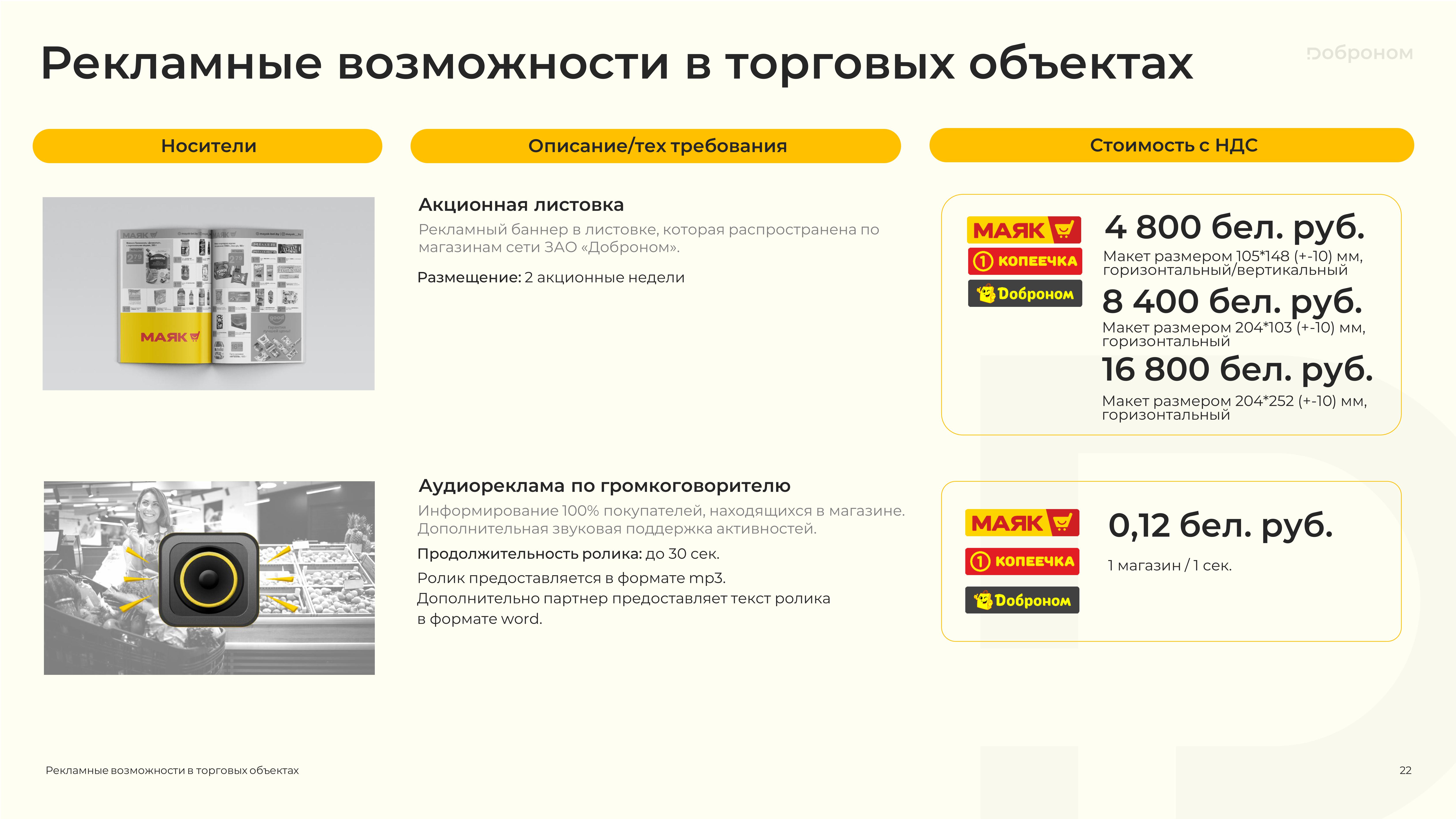 Размещение рекламы в магазинах «Доброном», «Копеечка» и «Маяк» — это гарантированная возможность для продвижения и повышения узнаваемости Вашего продукта. Мы предлагаем только лучшие и проверенные решения. Более подробную информацию о размещении рекламных материалов вы можете получить, ознакомившись с презентацией, или связавшись с нами по электронной почте.