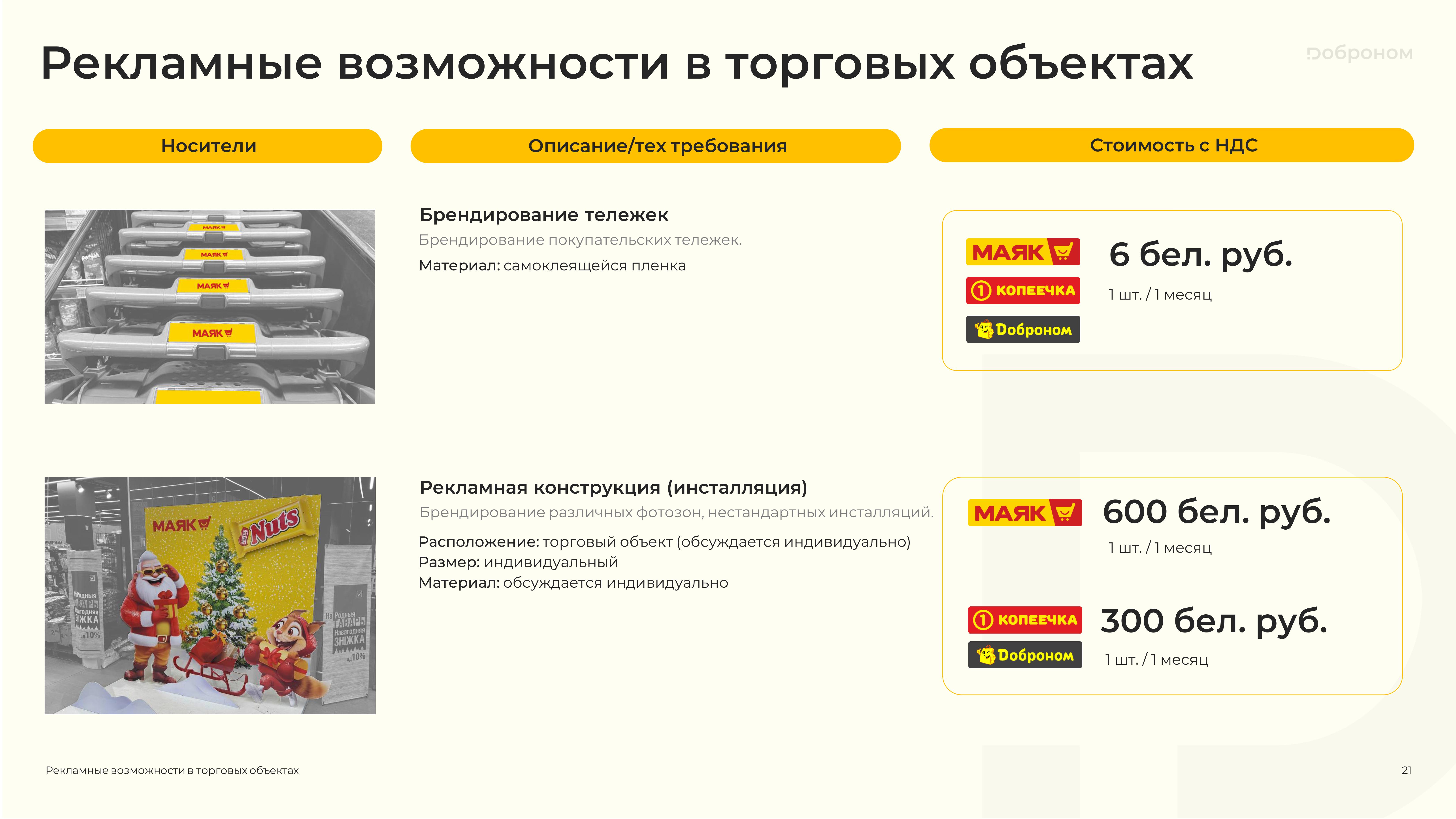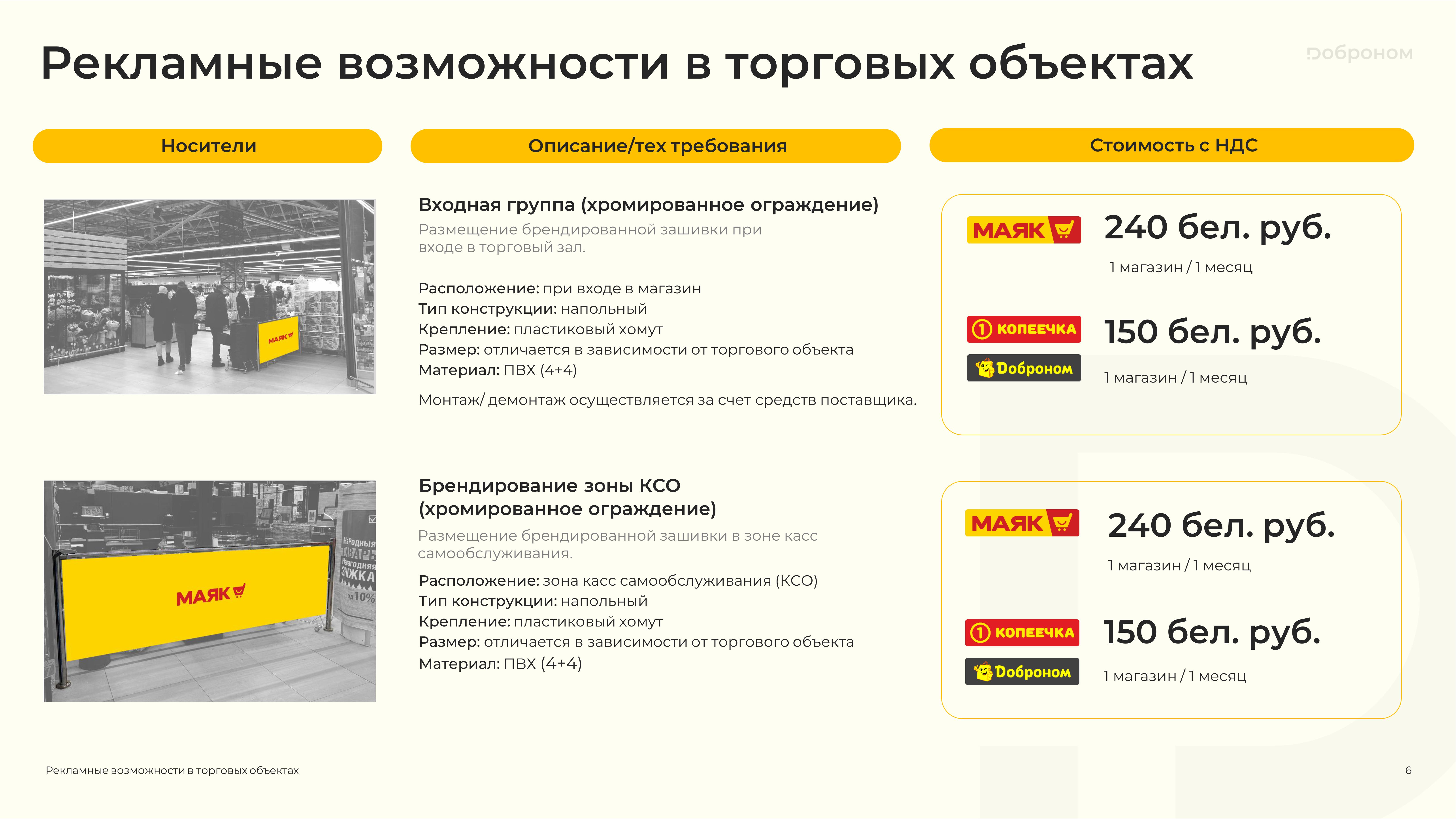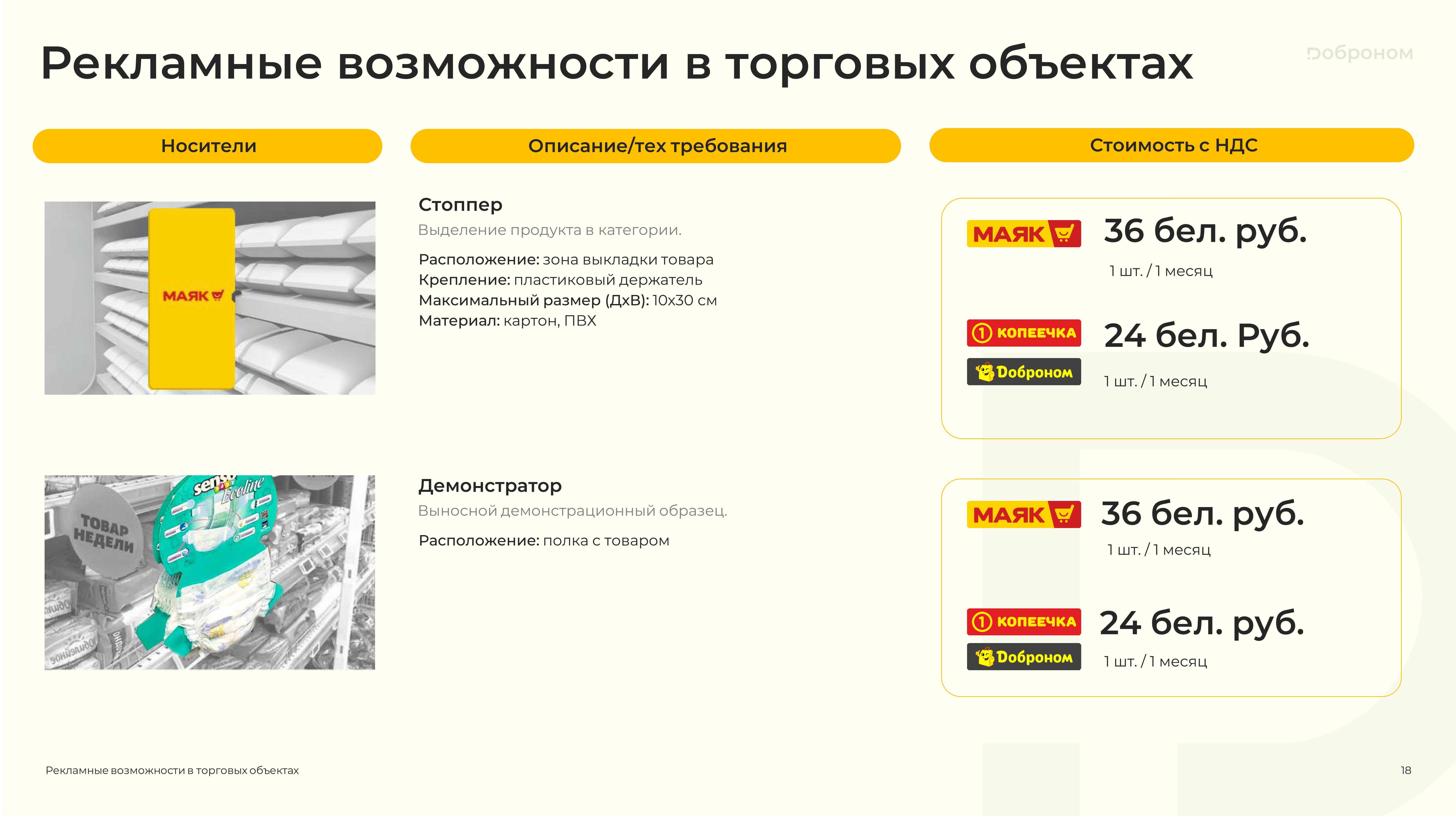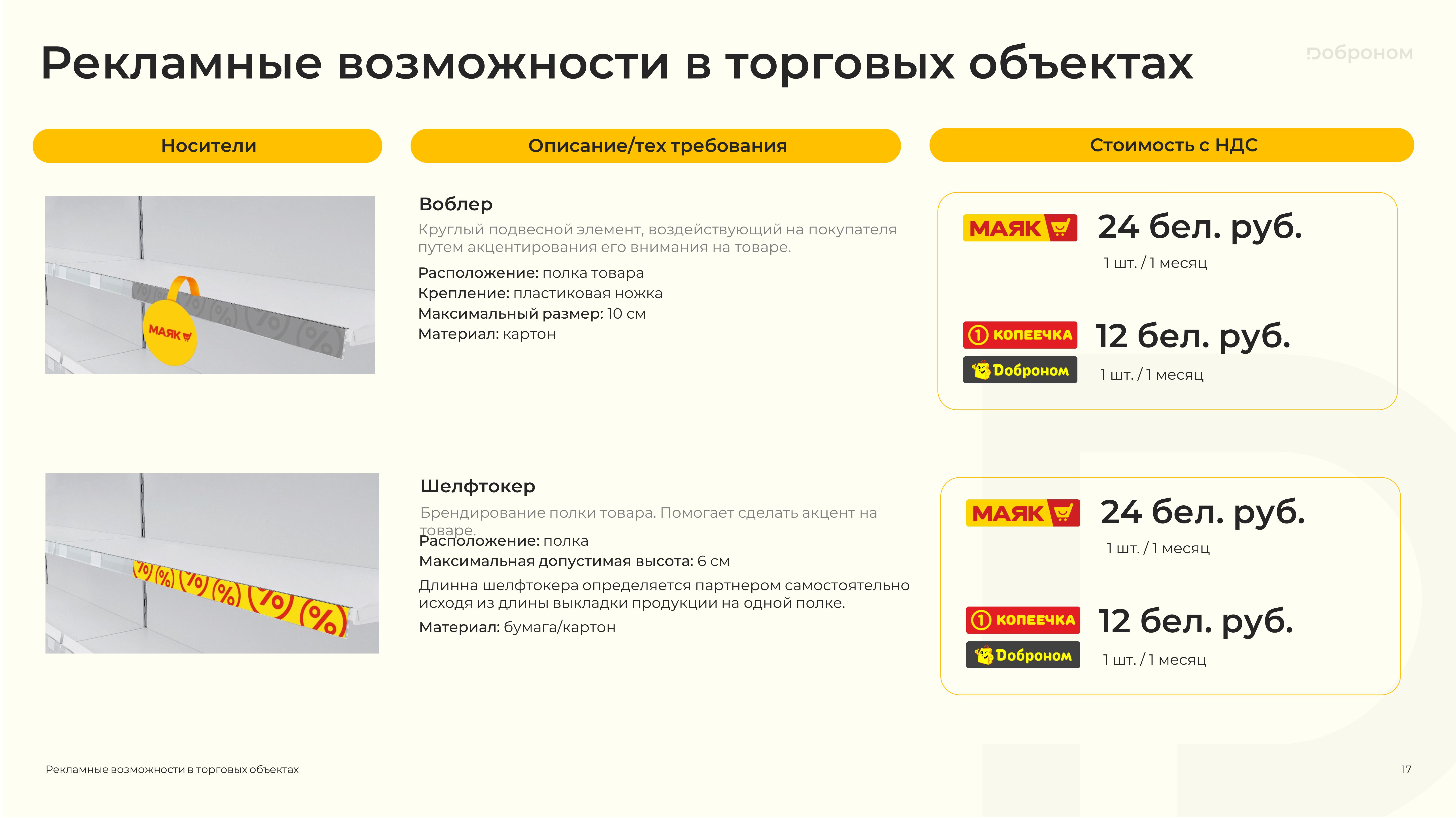 Размещение рекламы в магазинах «Доброном», «Копеечка» и «Маяк» — это гарантированная возможность для продвижения и повышения узнаваемости Вашего продукта. Мы предлагаем только лучшие и проверенные решения. Более подробную информацию о размещении рекламных материалов вы можете получить, ознакомившись с презентацией, или связавшись с нами по электронной почте.
