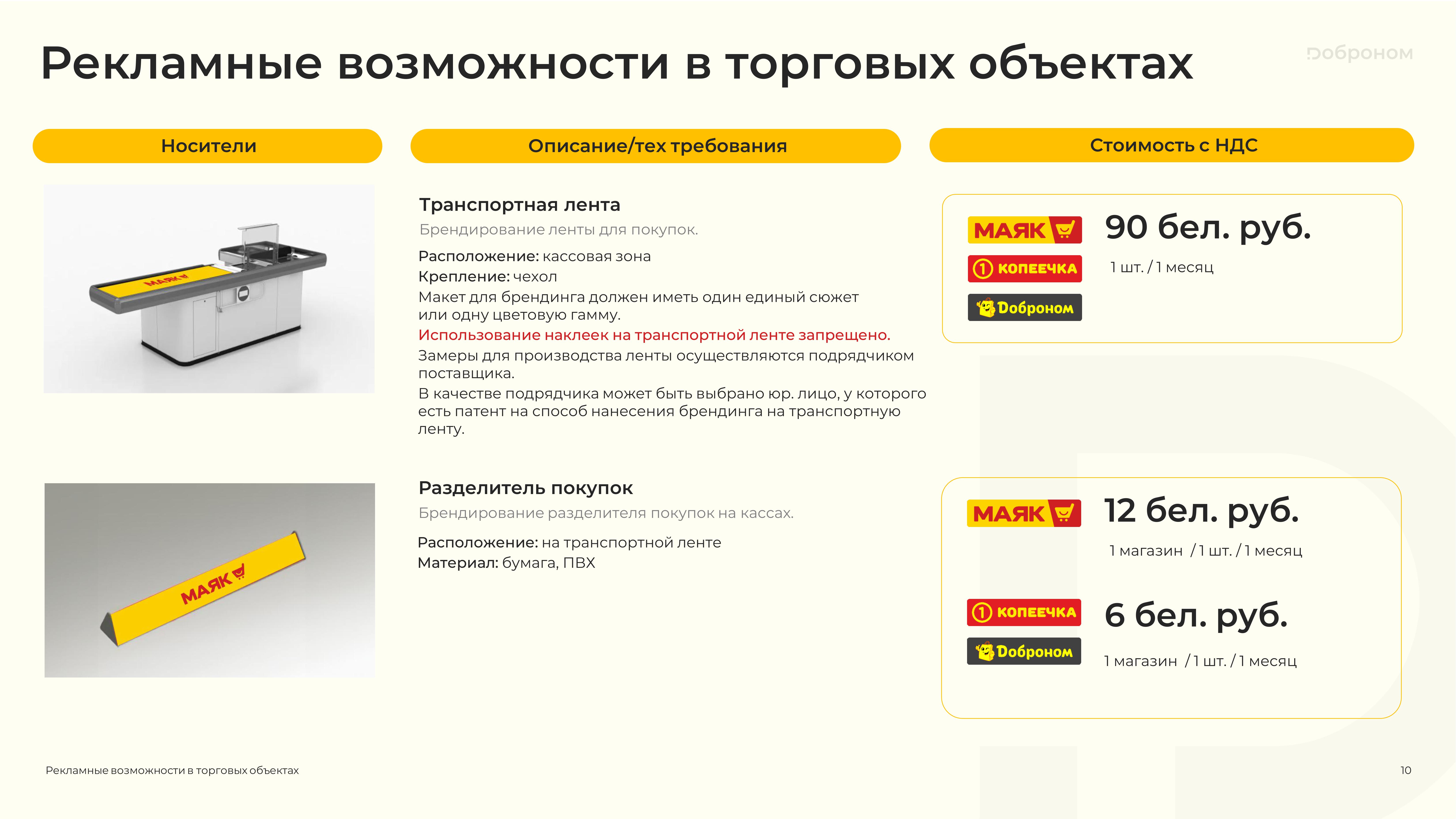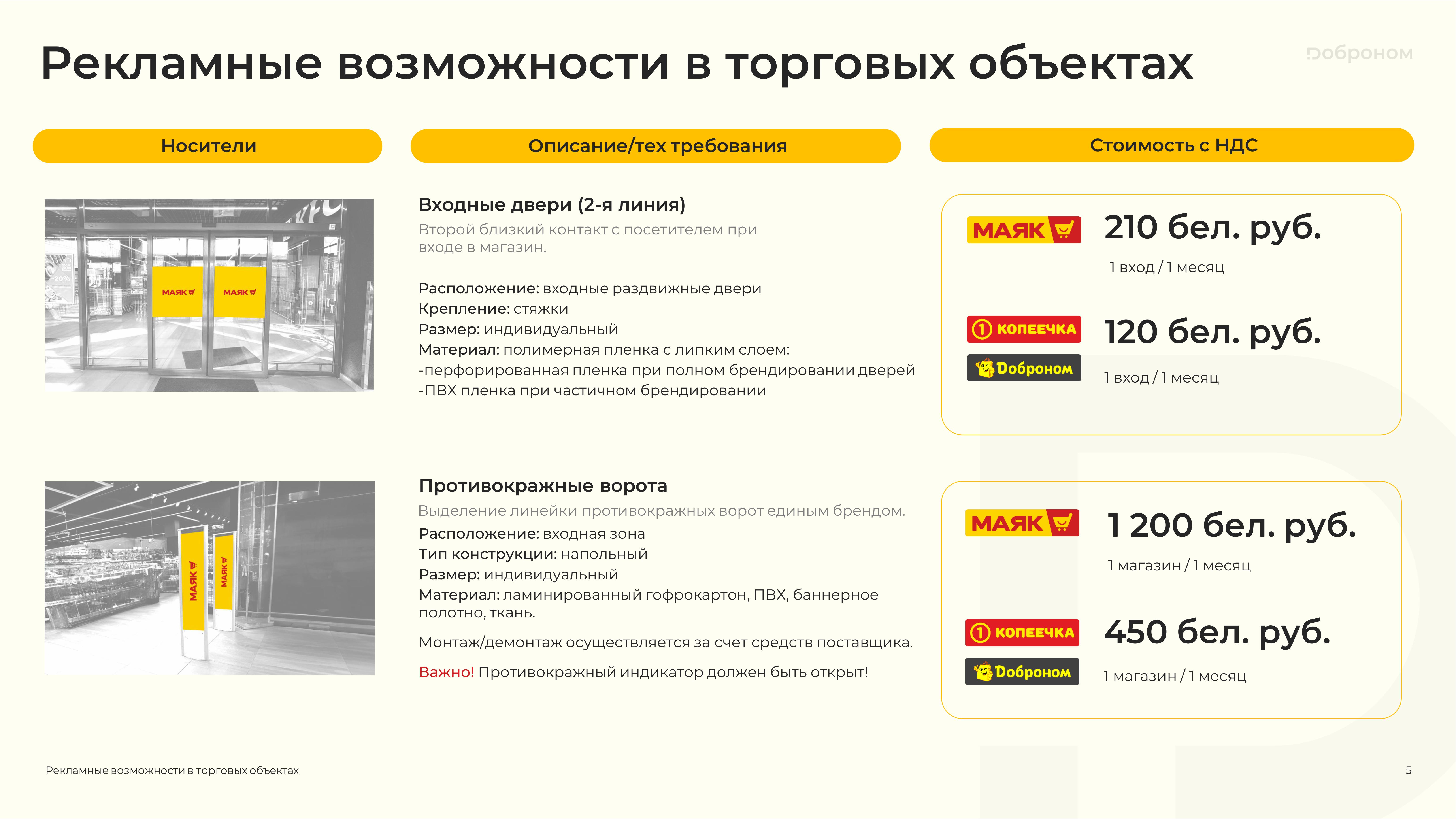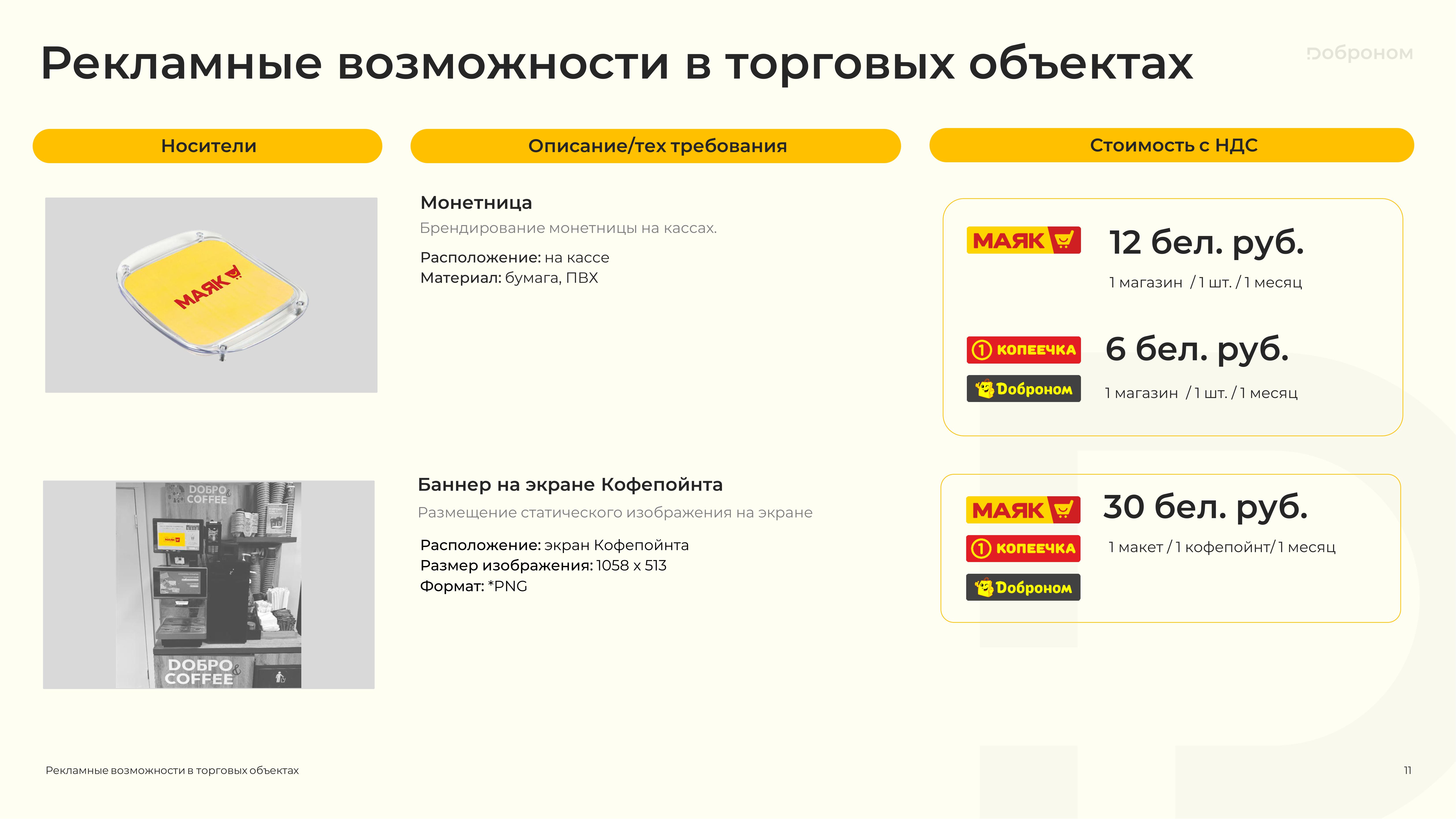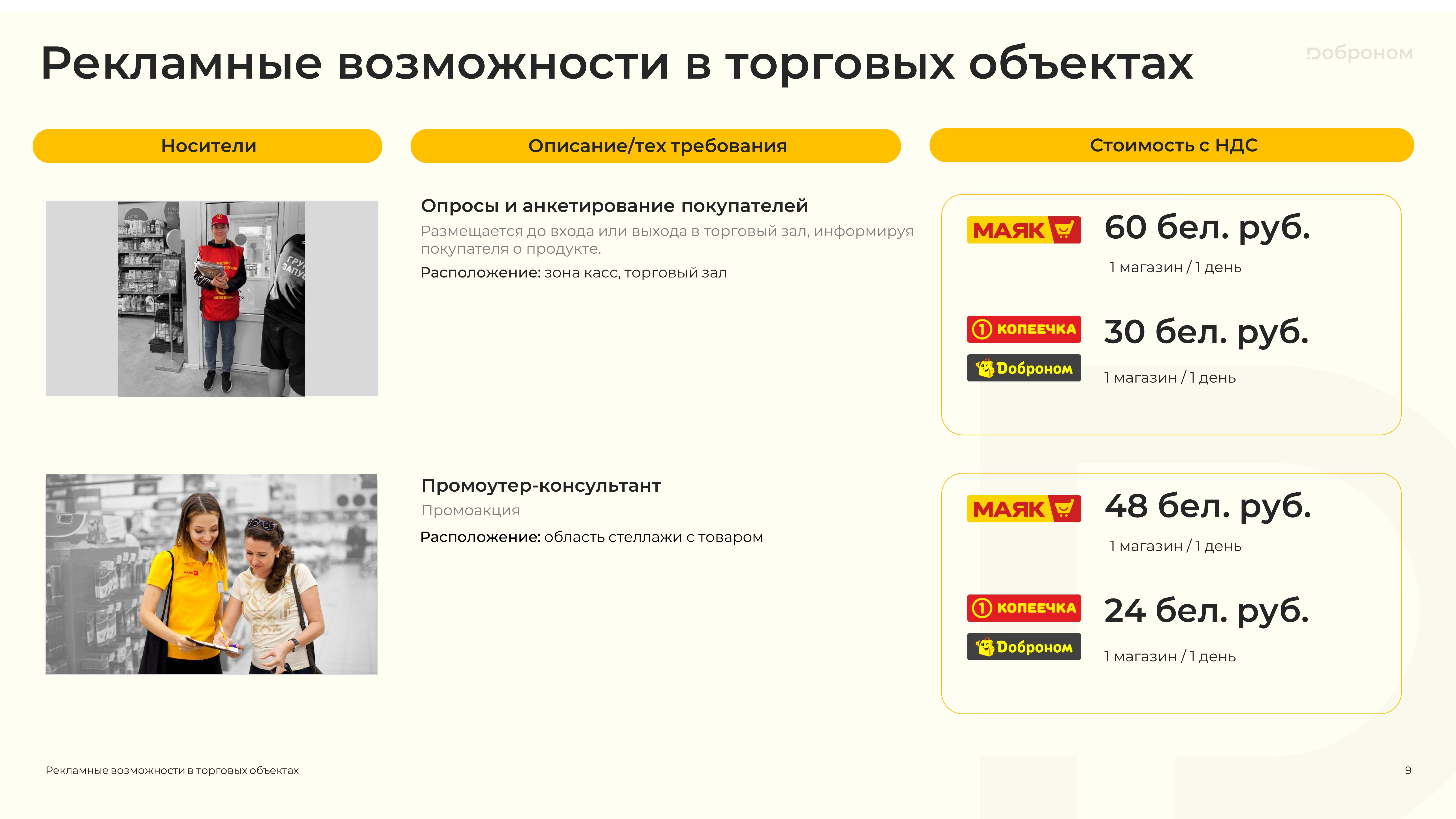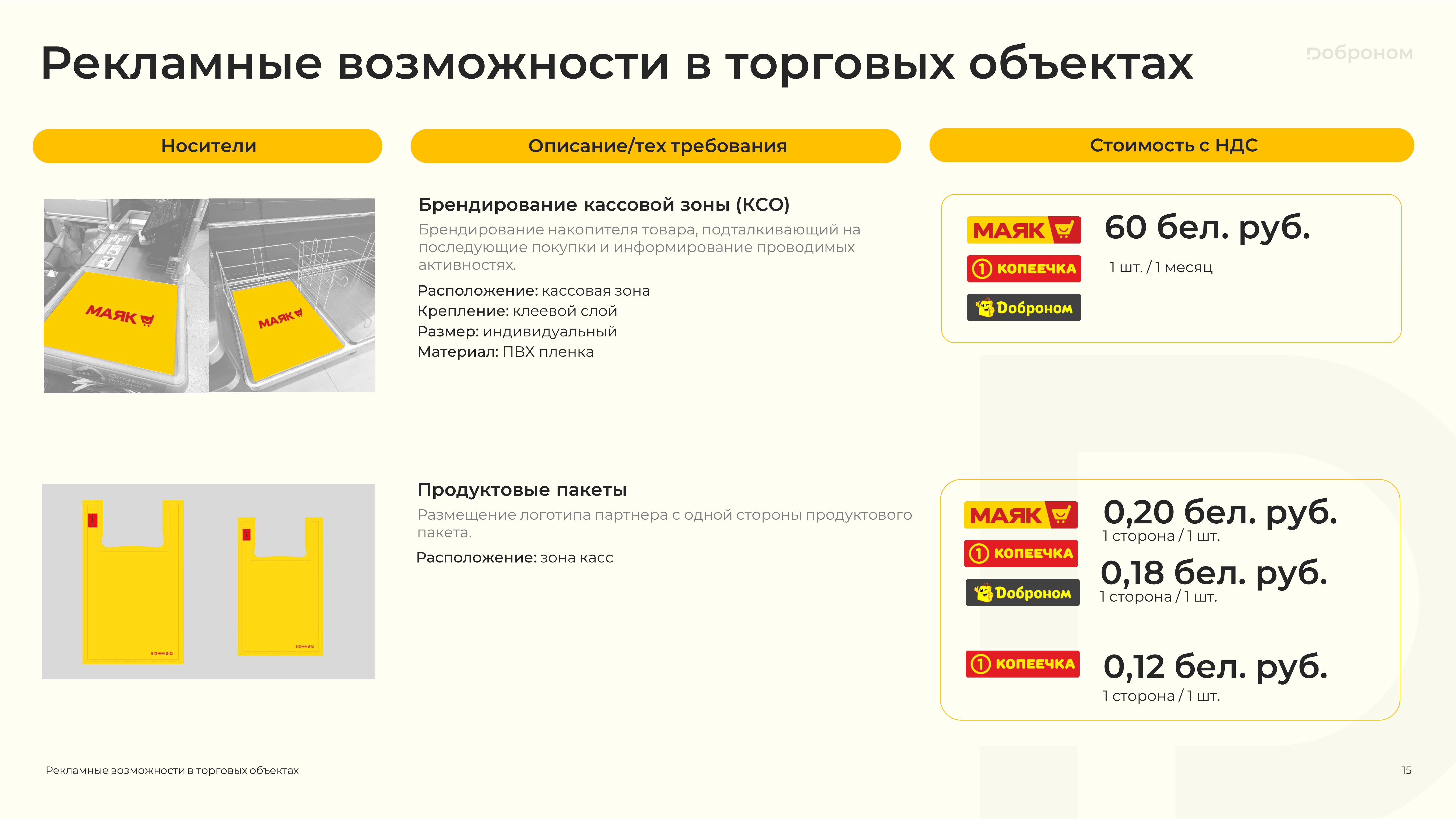 Размещение рекламы в магазинах «Доброном», «Копеечка» и «Маяк» — это гарантированная возможность для продвижения и повышения узнаваемости Вашего продукта. Мы предлагаем только лучшие и проверенные решения. Более подробную информацию о размещении рекламных материалов вы можете получить, ознакомившись с презентацией, или связавшись с нами по электронной почте.