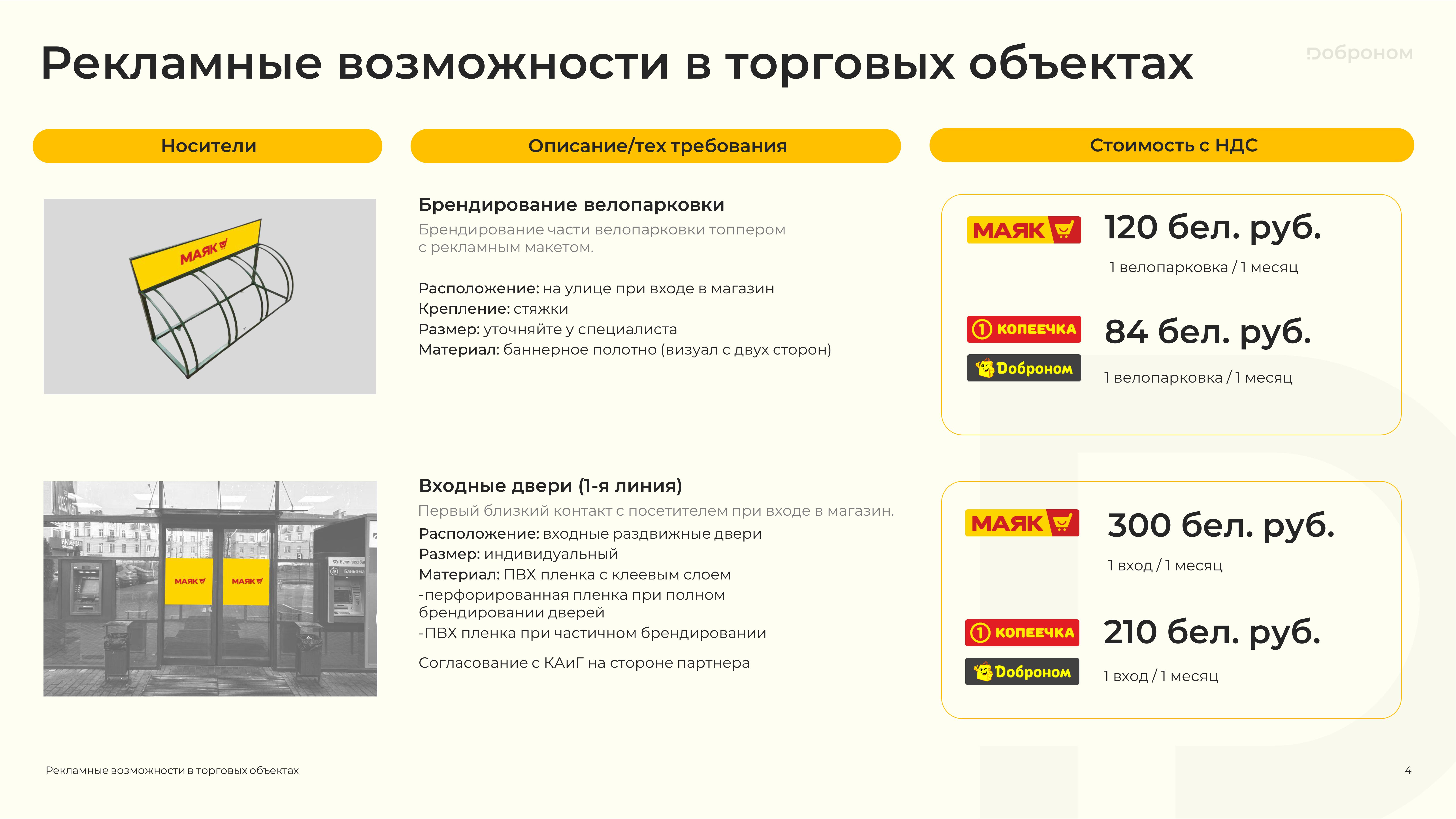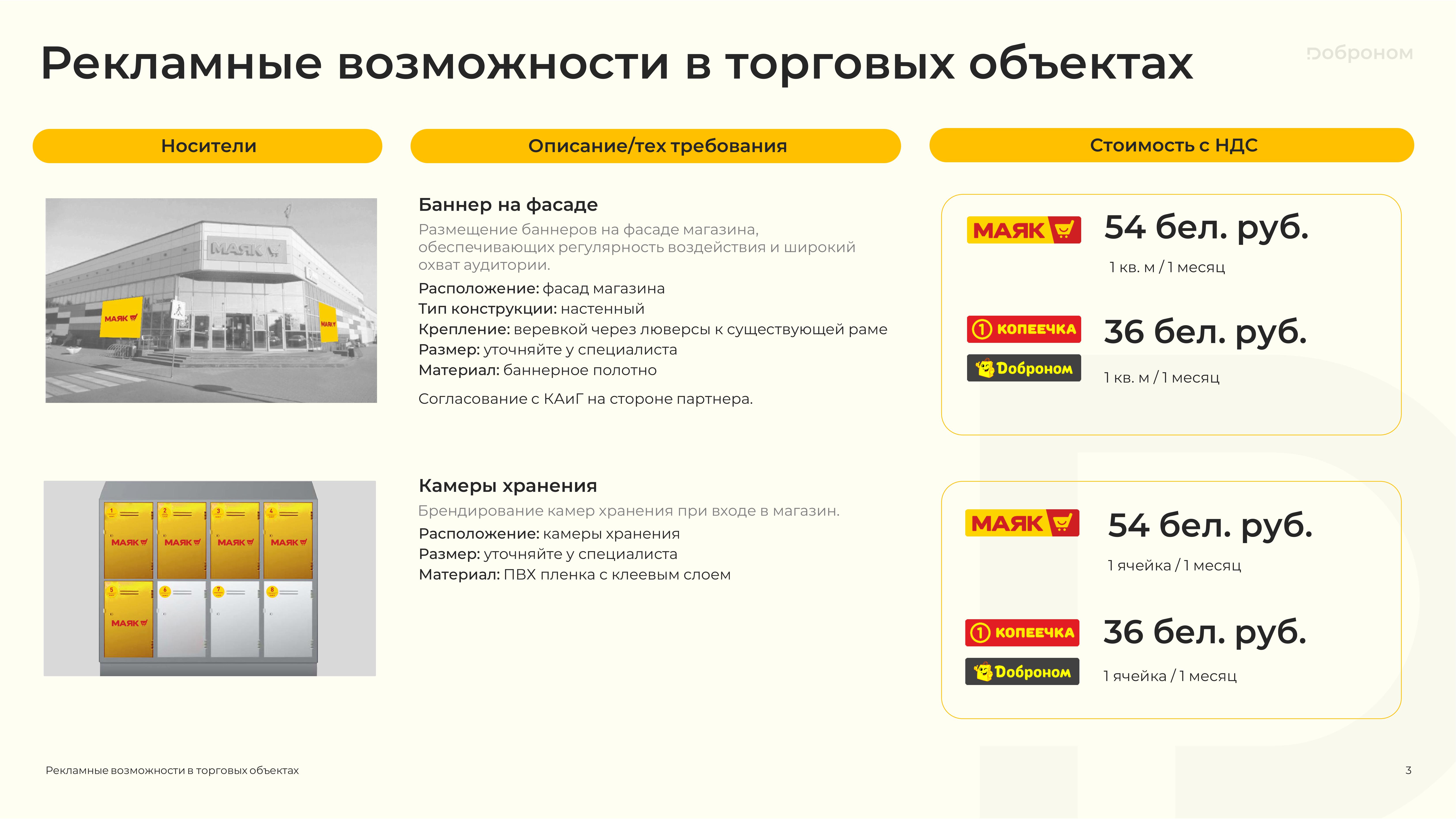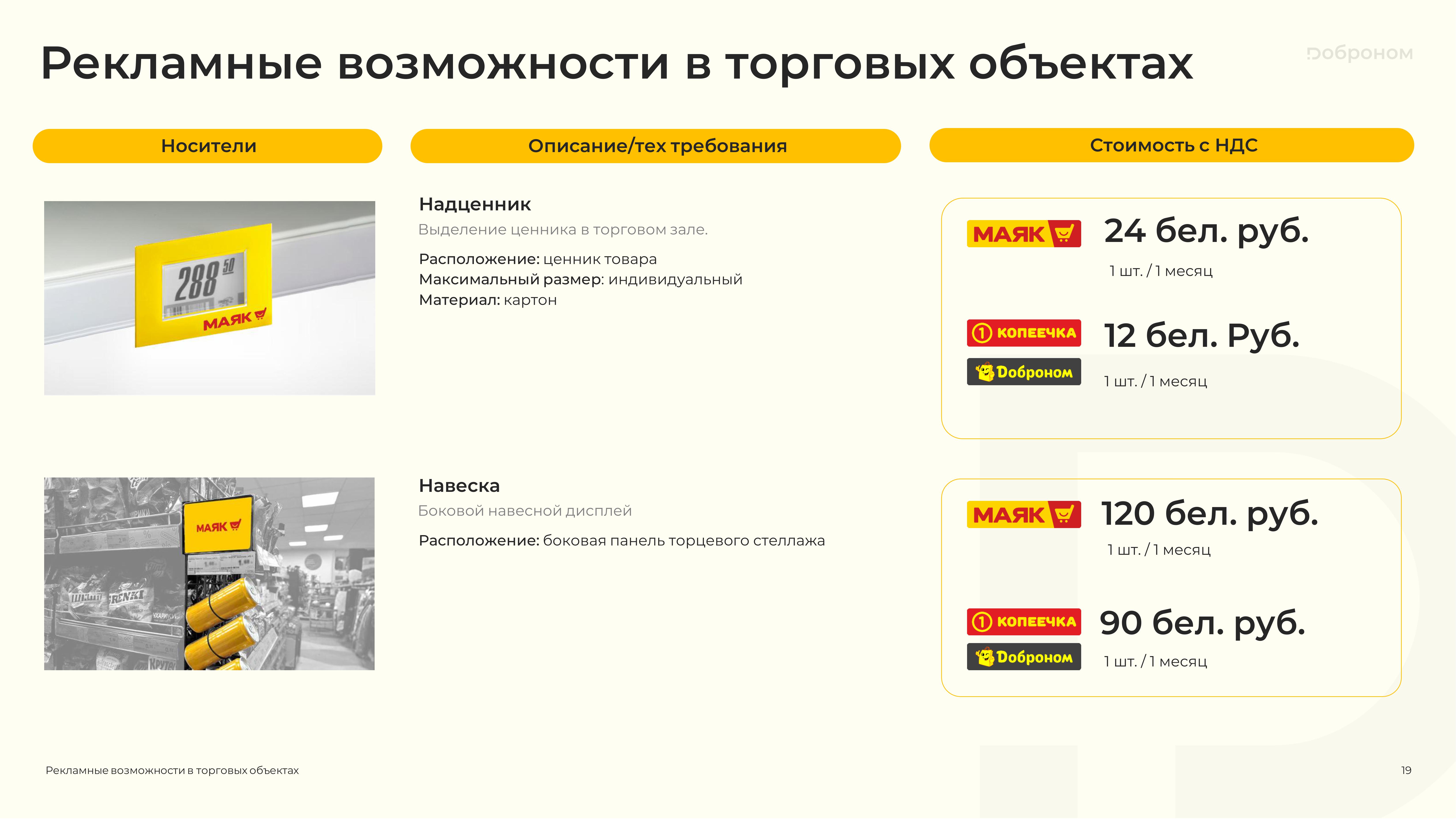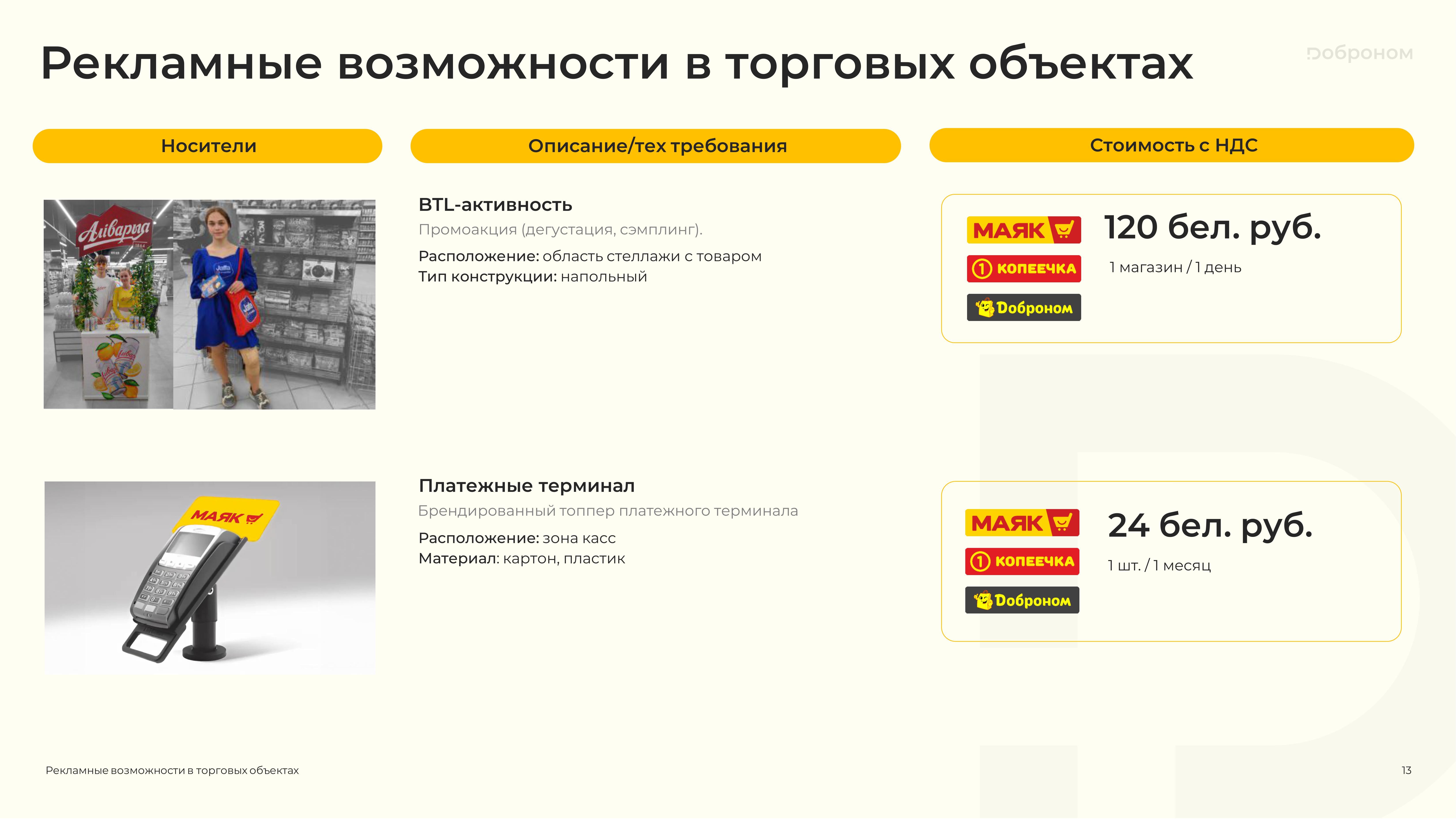 Размещение рекламы в магазинах «Доброном», «Копеечка» и «Маяк» — это гарантированная возможность для продвижения и повышения узнаваемости Вашего продукта. Мы предлагаем только лучшие и проверенные решения. Более подробную информацию о размещении рекламных материалов вы можете получить, ознакомившись с презентацией, или связавшись с нами по электронной почте.