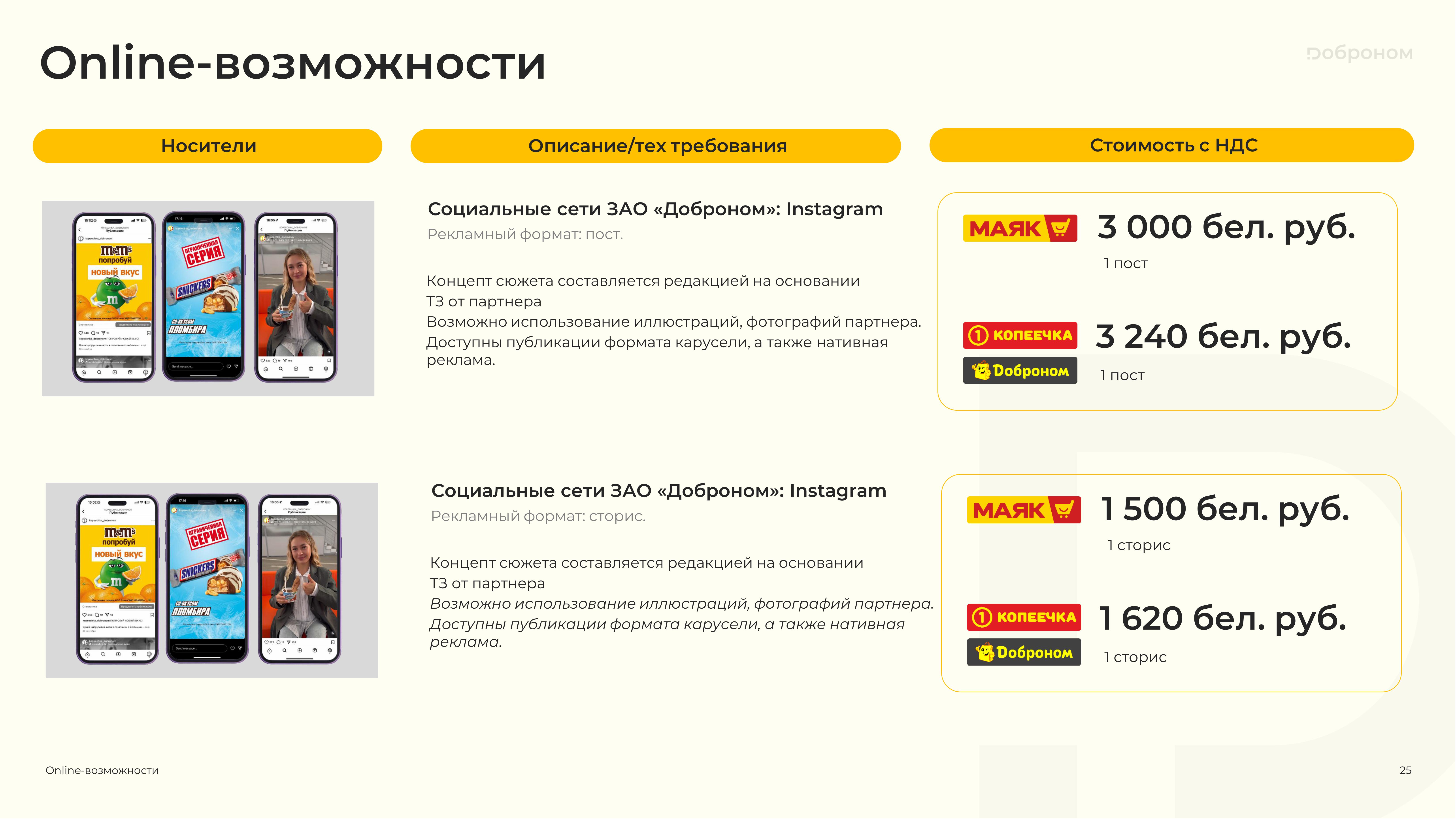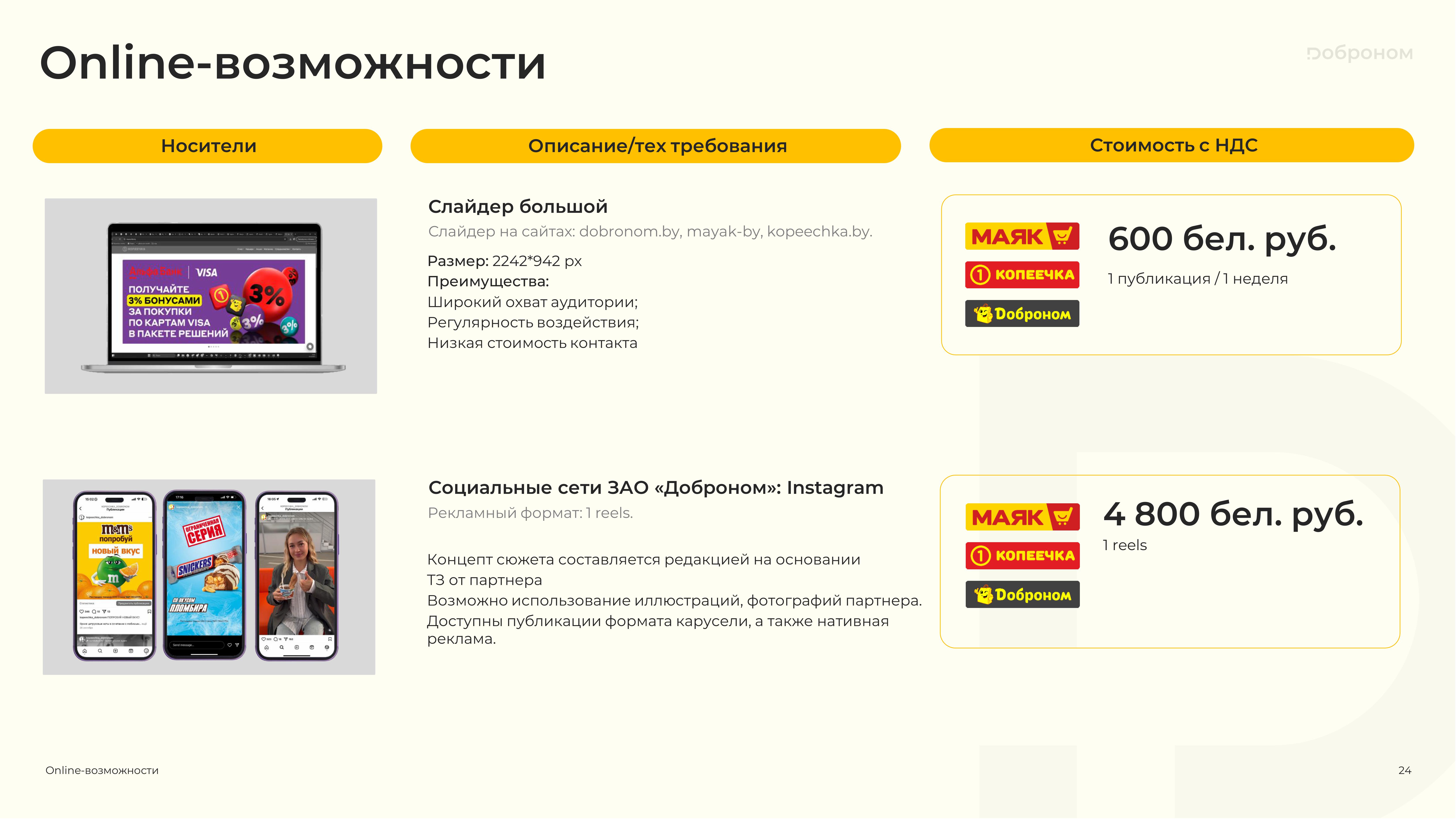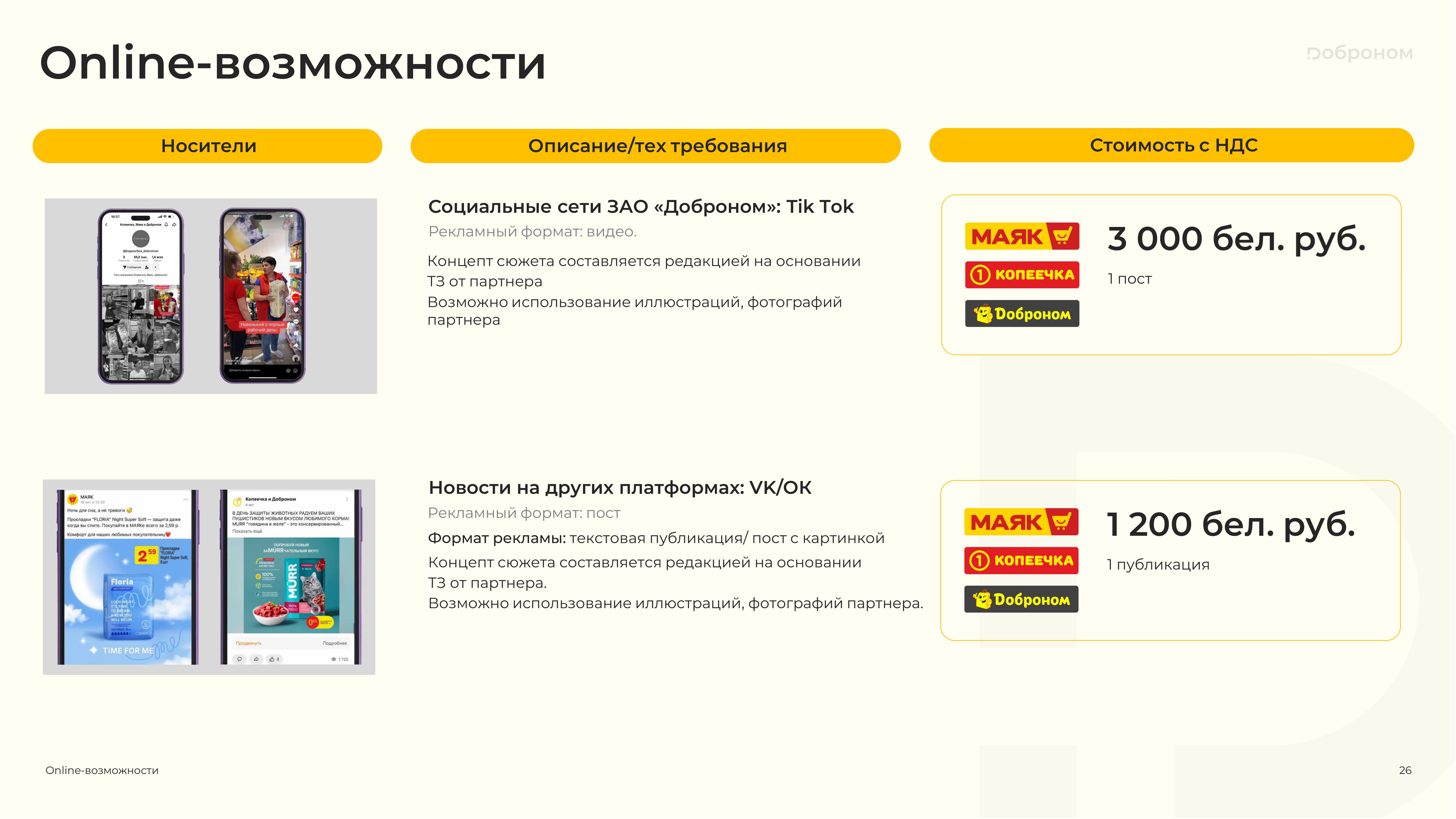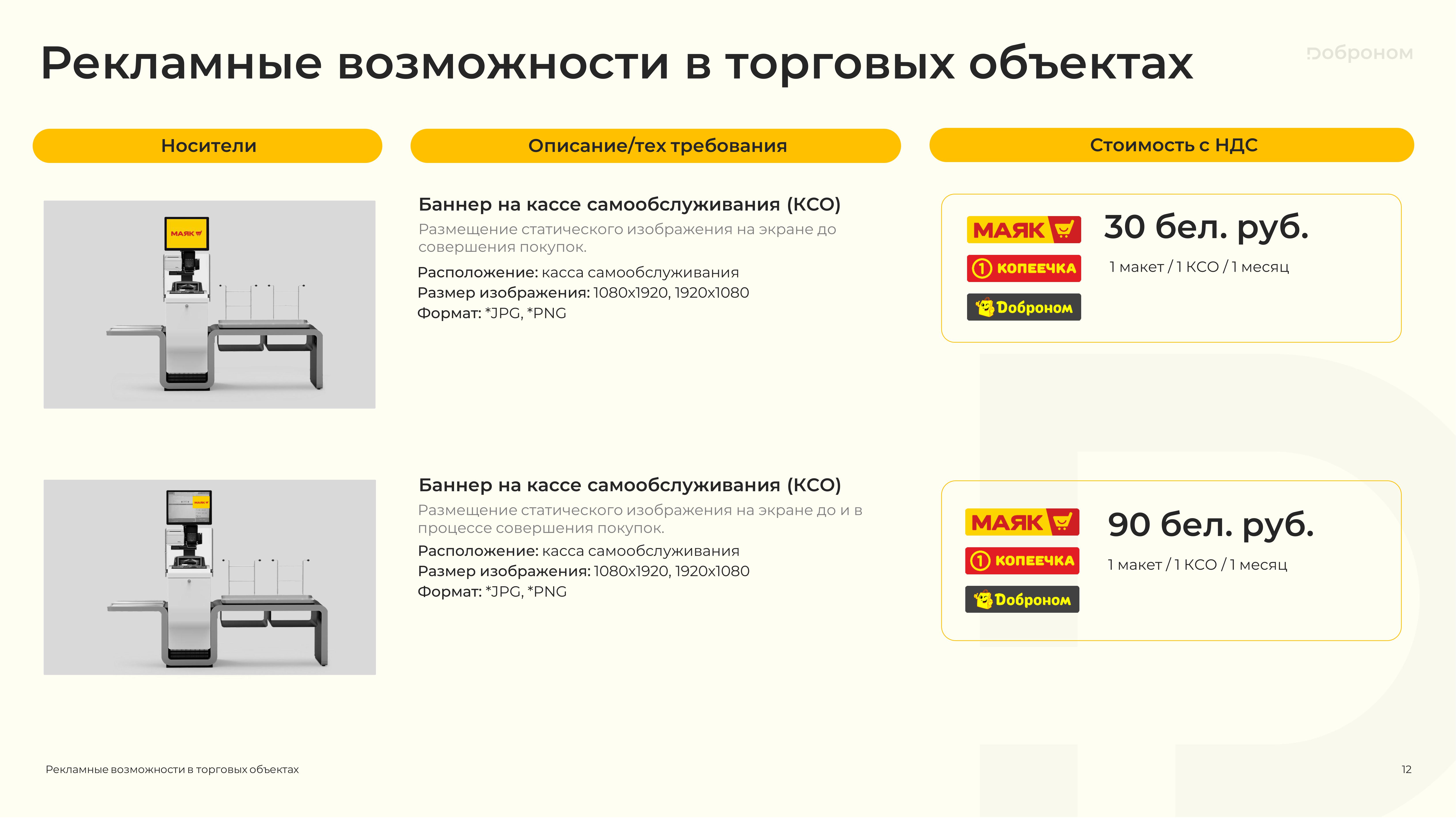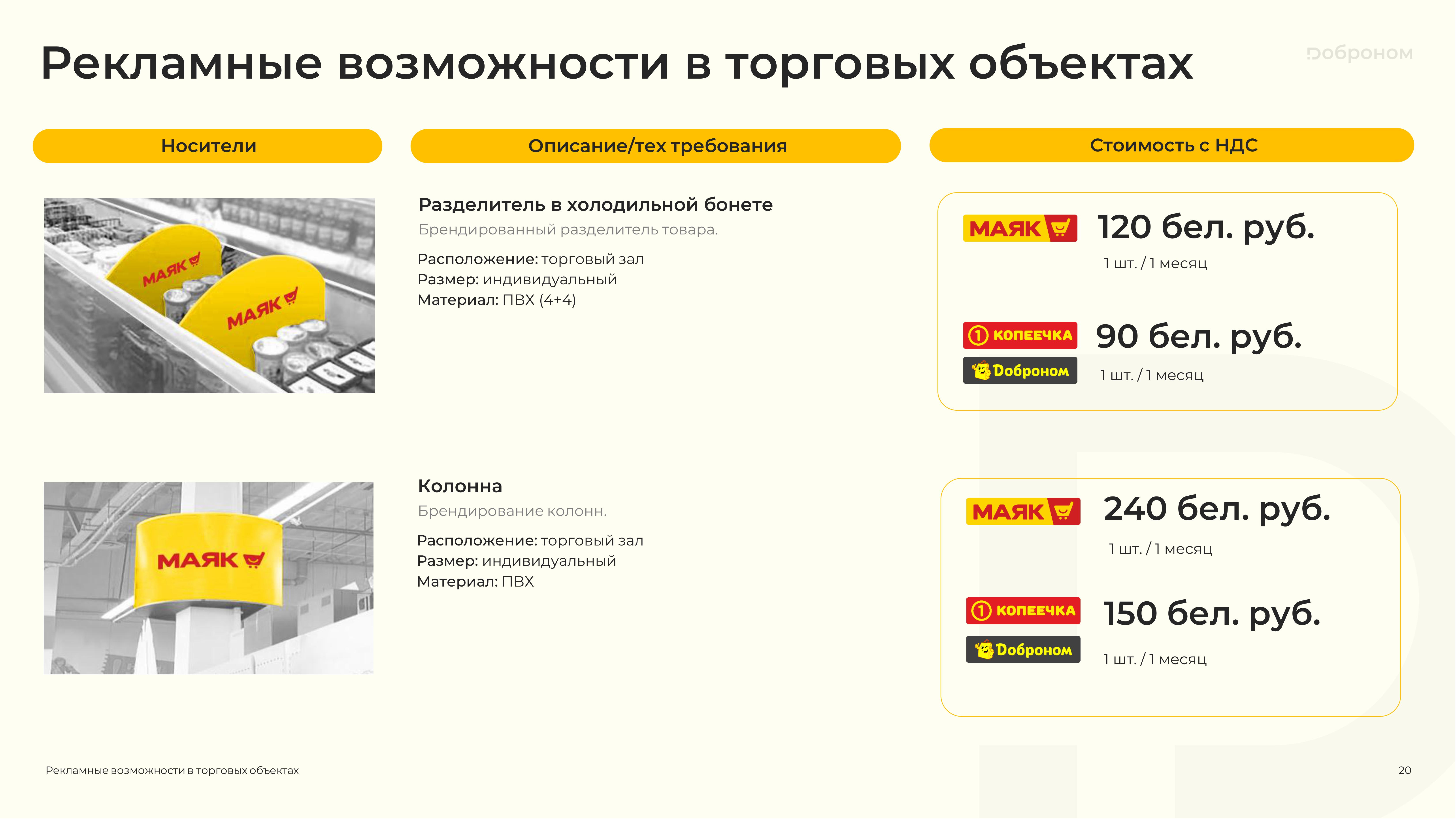 Размещение рекламы в магазинах «Доброном», «Копеечка» и «Маяк» — это гарантированная возможность для продвижения и повышения узнаваемости Вашего продукта. Мы предлагаем только лучшие и проверенные решения. Более подробную информацию о размещении рекламных материалов вы можете получить, ознакомившись с презентацией, или связавшись с нами по электронной почте.